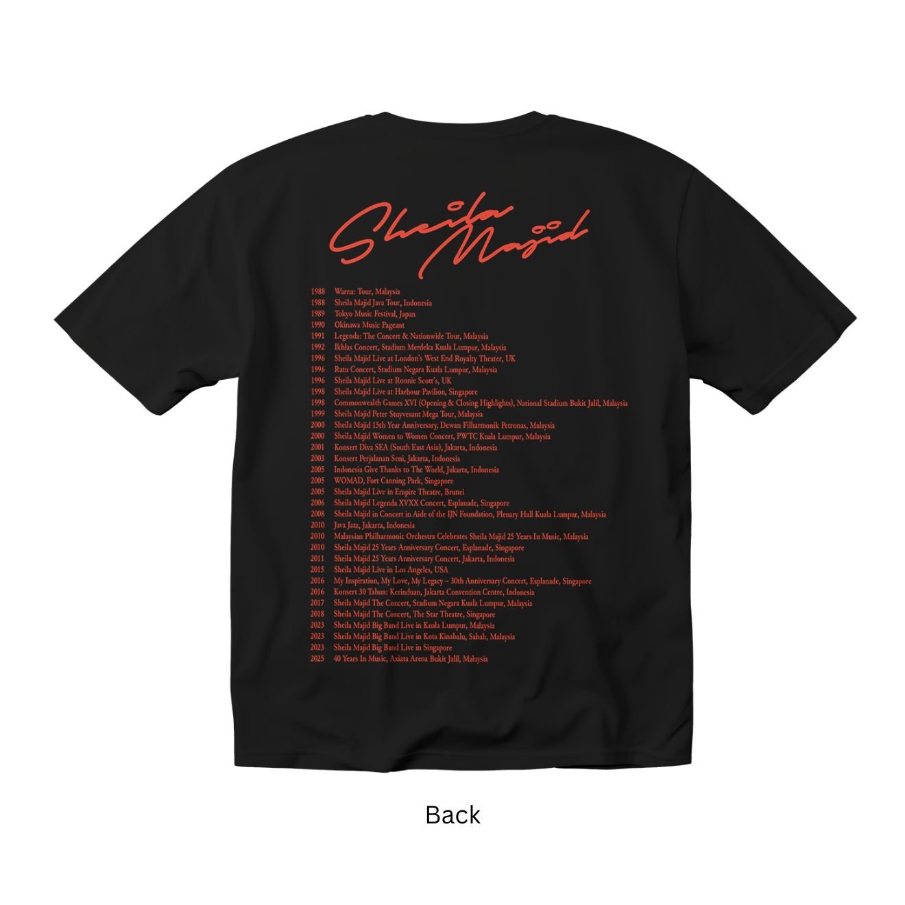 From her breakthrough in 1985 to becoming an icon of Malaysian music, this commemorative t-shirt represents a legacy of timeless melodies and unforgettable performances. Created specially for her anniversary concert series, it captures the warmth and unity she shares with her fans at every show — simple, timeless, and full of heart, just like her music.